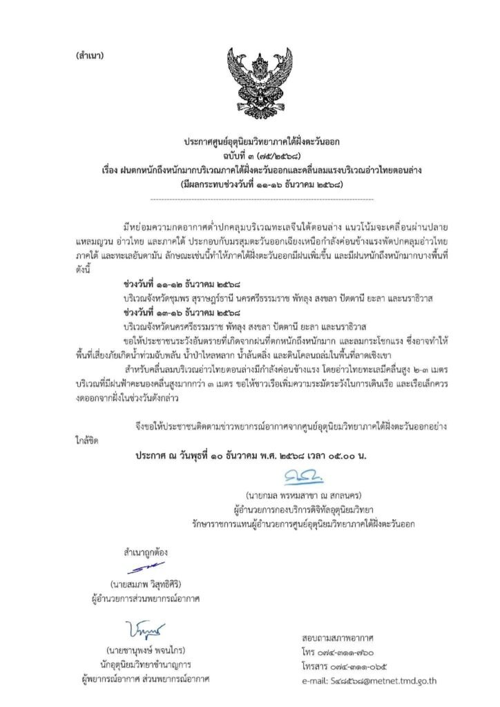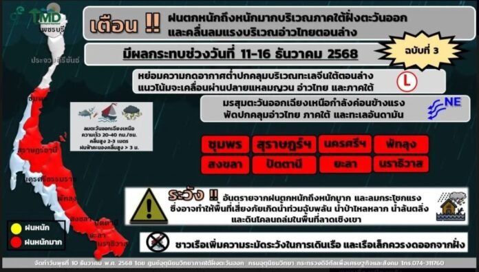 หลัง กรมอุตุนิยมวิทยา แจ้งเตือน ในช่วงวันที่ 11-16 ธันวาคม 2568 ภาคใต้มีฝนเพิ่มขึ้นและมีฝนตกหนักหลายพื้นที่