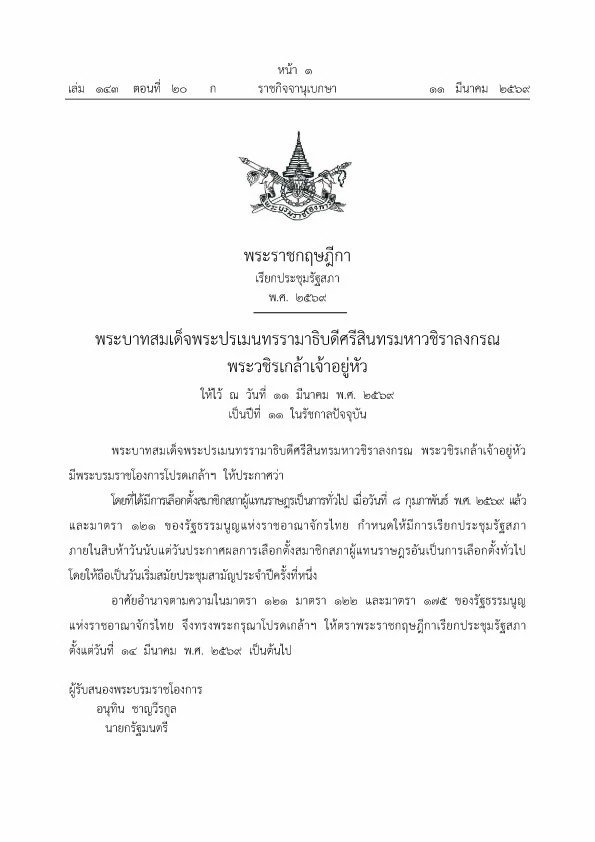 อาศัยอํานาจตามความในมาตรา 121 มาตรา 122 และมาตรา 175 ของรัฐธรรมนูญแห่งราชอาณาจักรไทย จึงทรงพระกรุณาโปรดเกล้าฯ ให้ตราพระราชกฤษฎีกาเรียกประชุมรัฐสภา ตั้งแต่วันที่ 14 มีนาคม พ.ศ. 2569 เป็นต้นไป