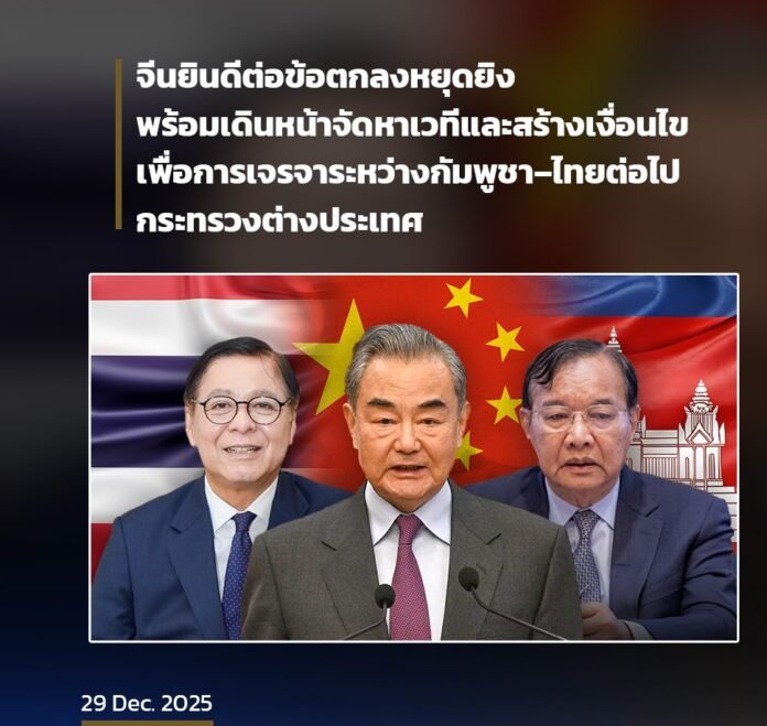 เมื่อวันที่ 28 และ 29 ธ.ค. 2568 รมว.ต่างประเทศ และเจ้าหน้าที่ระดับสูงทางทหารของจีน กัมพูชา และไทย ได้ร่วมประชุมกัน ณ บริเวณทะเลสาบฟู่เซียน มณฑลยูนนาน ประเทศจีน โดยฝ่ายจีนได้แสดงความยินดีต่อการลงนามในแถลงการณ์ร่วมของการประชุมคณะกรรมการชายแดนทั่วไป (จีบีซี) สมัยพิเศษ ครั้งที่ 3 ระหว่างกัมพูชาและไทย เมื่อวันที่ 27 ธ.ค. 2568