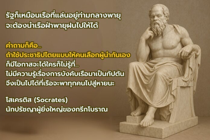 โซเครตีสเปรียบเทียบว่า หากเราต้องการรองเท้า เราจะไปหาช่างทำรองเท้า หากเราเจ็บป่วย เราจะไปหาแพทย์ ผู้มีความรู้ความชำนาญเฉพาะทาง แต่เหตุใดในเรื่องที่สำคัญที่สุดอย่าง “การบริหารบ้านเมือง” เราจึงอนุญาตให้ใครก็ได้—ไม่ว่าจะมีความรู้หรือวิจารณญาณหรือไม่—เป็นผู้ตัดสินใจ?