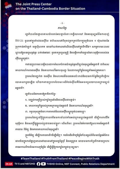 รัฐบาลไทยขอประณามอย่างรุนแรงต่อการกระทำอันโหดร้ายและไร้มนุษยธรรมของฝ่ายกัมพูชา จากการใช้อาวุธจรวด BM-21 ยิงตกเข้ามาในพื้นที่พลเรือนในเขตแดนไทย