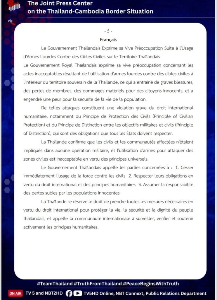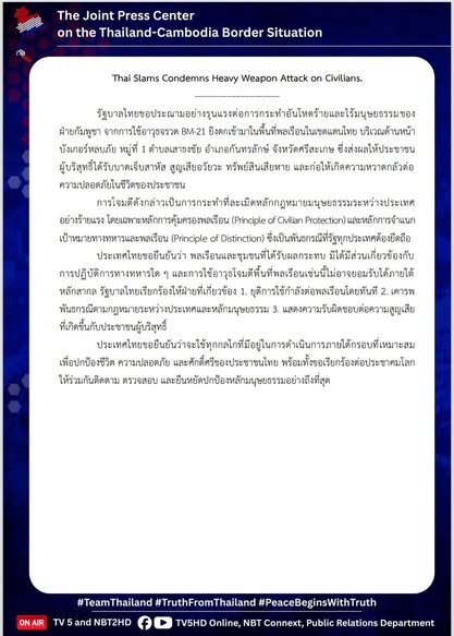 ประเทศไทยขอยืนยันว่า พลเรือนและชุมชนที่ได้รับผลกระทบ มิได้มีส่วนเกี่ยวข้องกับการปฏิบัติการทางทหารใด ๆ และการใช้อาวุธโจมตีพื้นที่พลเรือนเช่นนี้ไม่อาจยอมรับได้ภายใต้หลักสากล