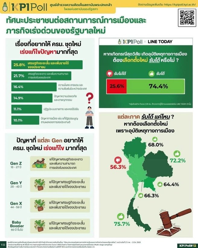 ผลสำรวจครั้งนี้ สะท้อนภาพความคาดหวังของประชาชนต่อรัฐบาลชุดใหม่อย่างชัดเจนว่า “ปัญหาปากท้องคือวาระแห่งชาติที่แท้จริง” แต่ละช่วงวัยมีโจทย์ชีวิตต่างกัน วัยทำงานและวัยเกษียณ ต้องการนโยบายเศรษฐกิจระยะสั้นเพื่อความอยู่รอดเฉพาะหน้า ขณะที่กลุ่มคนรุ่นใหม่ อยากให้มุ่งเน้นไปที่การแก้โครงสร้างระยะยาว ในขณะที่ประเด็นความขัดแย้งหรือโครงสร้างทางการเมืองถูกมองสำคัญเป็นลำดับรอง ส่งสัญญาณชัดว่า รัฐบาลใหม่ไม่มีเวลาฮันนีมูน และจะต้องเร่งดันนโยบายบรรเทาค่า ครองชีพที่เป็นรูปธรรมออกมาเป็น Quick Win ทันที ขณะเดียวกัน ประชาชนส่วนใหญ่ยังยอมรับได้หากต้องกลับไปใช้การเลือกตั้งใหม่เพื่อคลี่คลายปัญหาทางการเมือง สะท้อนว่าทั้ง “ความอยู่รอดทางเศรษฐกิจ” และ “ความชอบธรรมทางการเมือง” คือ สองเงื่อนไขสำคัญที่รัฐบาลใหม่ต้องตอบประชาชนให้ได้พร้อมๆ กัน เสถียรภาพของรัฐบาลอาจไม่ได้ขึ้นอยู่กับเกมการเมืองในสภาเท่านั้น แต่ถูกแขวนไว้กับผลงานการแก้ปัญหาเศรษฐกิจเป็นสำคัญ หากสอบตกเรื่องปากท้อง ประชาชนก็ไม่หวาดกลัวความเปลี่ยนแปลงทางการเมืองที่อาจเกิดขึ้นในอนาคต