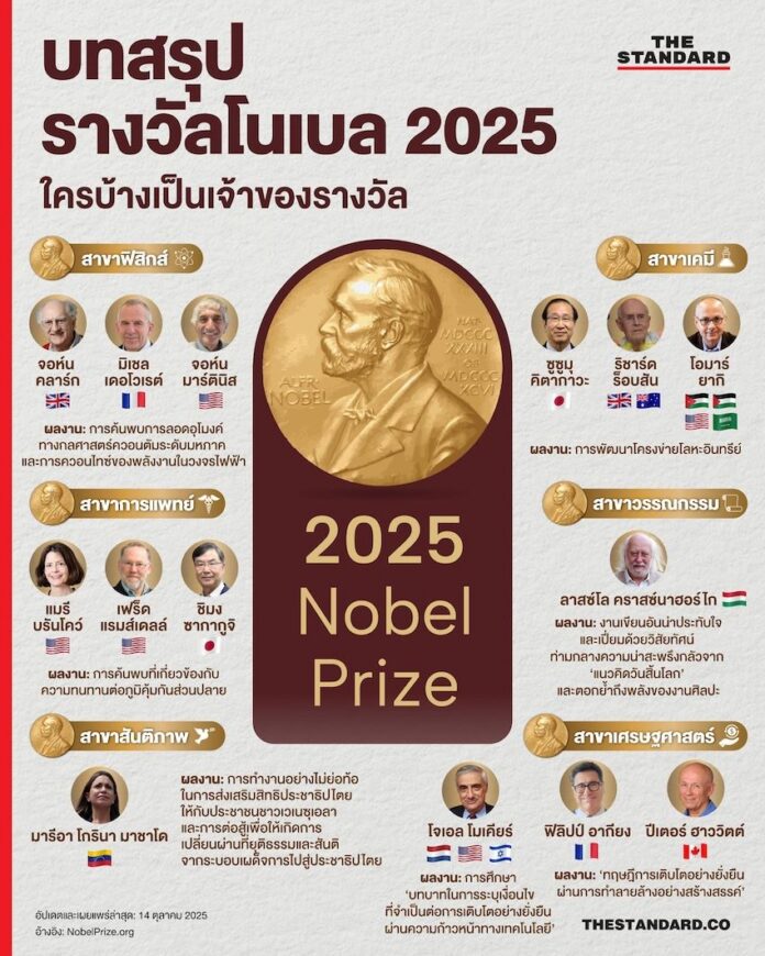 เสร็จสิ้นไปเป็นที่เรียบร้อยแล้วสำหรับการประกาศผลรางวัลโนเบลประจำปี 2025 ทั้ง 6 สาขา นี่คือ โฉมหน้าของเจ้าของรางวัลโนเบลในปีนี้ โดยพิธีมอบรางวัลจะจัดขึ้นที่กรุงสตอกโฮล์ม เมืองหลวงของสวีเดน ในวันที่ 10 ธันวาคม 2025