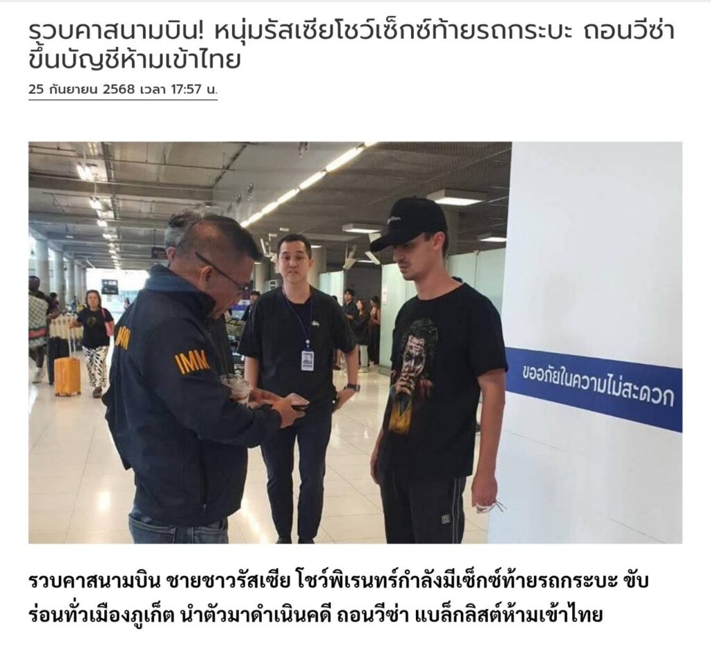 โดนรวบคาสนามบินสุวรรณภูมิ ตร.เตรียมถอนวีซ่า แบล็กลิสต์ห้ามเข้าไทย จากกรณีคลิปวิดีโอที่ชาวบ้านในพื้นที่ภูเก็ตถ่ายภาพชาวต่างชาติทำคอนเทนต์พิเรนทร์ท้ายรถกระบะ โดยปรากฏภาพชายหญิงคู่หนนึ่งกำลังมีเซ็กซ์อยู่ที่ท้ายรถกระบะสีดำ วิ่งไปตามถนน บายพาส ขาออกนอกเมือง