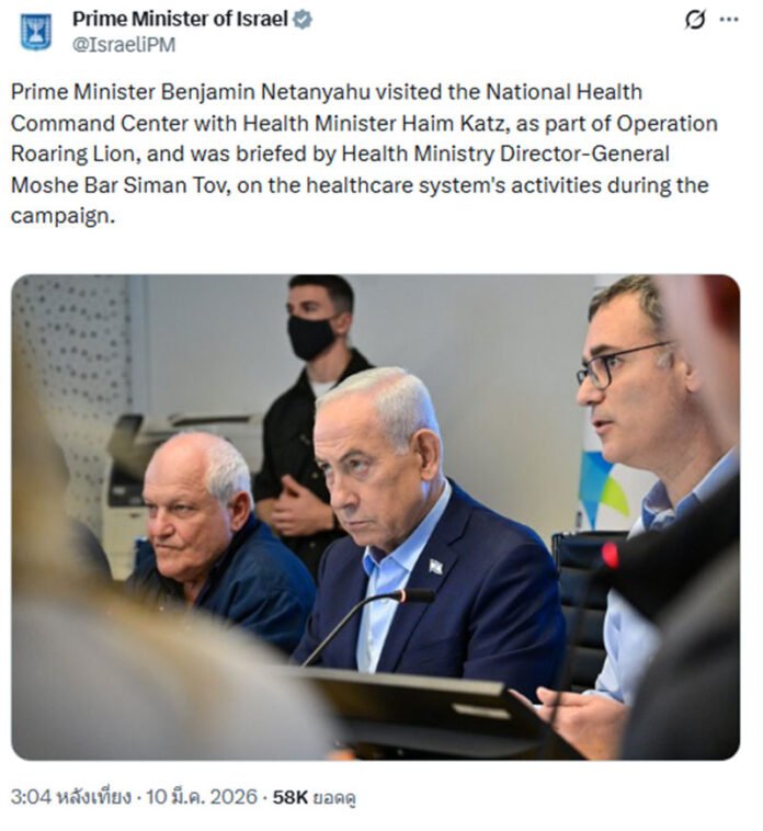 ก่อนหน้านี้  เบนจามิน เนทันยาฮู แถลงในวันจันทร์ที่ 10 มี.ค. ขณะได้รับฟังการบรรยายสรุปจากเจ้าหน้าที่สาธารณสุขที่ศูนย์ควบคุมสุขภาพแห่งชาติ ผู้นำอิสราเอลระบุว่าจากการปฏิบัติการทางทหารที่ผ่านมา กองทัพอิสราเอลกำลังบดขยี้ยุทธศาสตร์ของอิหร่านอย่างหนักหน่วง และยืนยันว่าจะมีปฏิบัติการที่รุนแรงกว่านี้ตามมาอีกในอนาคต
