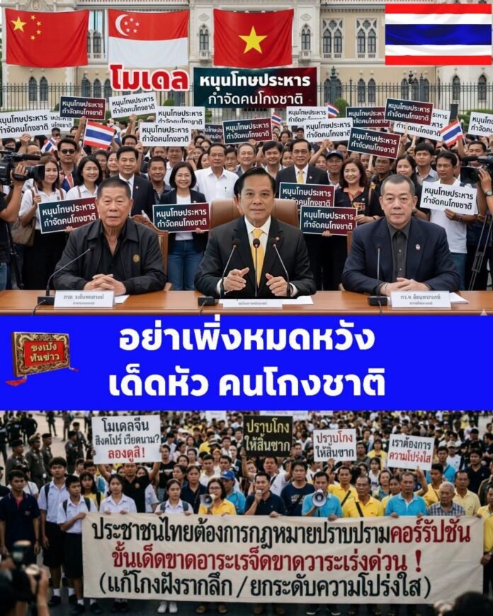คนไทยใครยังไม่หมดหวัง มาช่วยกันส่งเสียง ดันให้ถึงรัฐบาล “หนุนใช้โมเดล จีน,สิงคโปร์,เวียดนาม ออกกฎหมาย ปราบคอรัปชั่นขั้นเด็ดขาด(โกง=ประหาร) เพื่อแก้ปัญหาการโกงที่ฝังรากลึกและ ยกระดับความโปร่งใสในภาครัฐ เพราะนี่คือปัญหาใหญ่ ของชาติอย่างแท้จริง