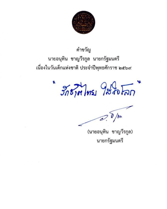 วันที่ 16 ธ.ค. ที่ทำเนียบรัฐบาล น.ส.ลลิดา เพริศวิวัฒนา รองโฆษกประจำสำนักนายกรัฐมนตรี แถลงผลการประชุมคณะรัฐมนตรี (ครม.) ว่า นายอนุทิน ชาญวีรกูล นายกฯ และรมว.มหาดไทย ได้มอบคำขวัญวันเด็ก ประจำปี 2569 ซึ่งตรงกับวันเสาร์ที่ 10 ม.ค. 2569 ระบุว่า “รักชาติไทย ใส่ใจโลก”