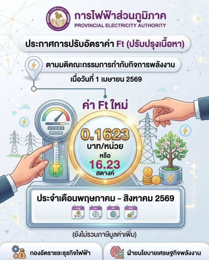 – อัตราใหม่ (พ.ค. – ส.ค. 2569): 0.1623 บาทต่อหน่วย