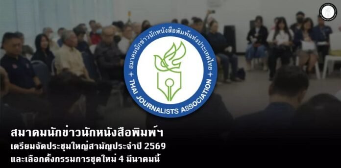 กรุงเทพมหานคร – สมาคมนักข่าวนักหนังสือพิมพ์แห่งประเทศไทย กำหนดจัดประชุมใหญ่สามัญประจำปี 2569 ในวันพุธที่ 4 มีนาคม 2569 เวลา 10.00 น. ณ ห้อง 501 ชั้น 5 อาคารเดอะไรซ์ สี่แยกสะพานควาย โดยมีวาระสำคัญคือการแถลงผลการดำเนินงานในรอบปี 2568, รับรองงบดุล และการเลือกตั้งคณะกรรมการบริหารชุดใหม่