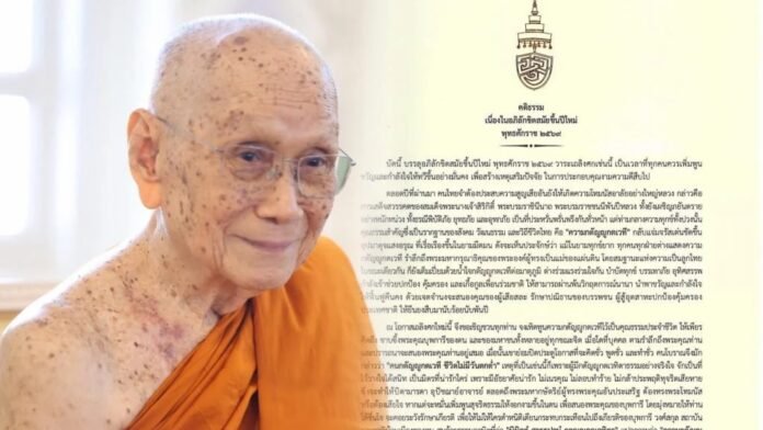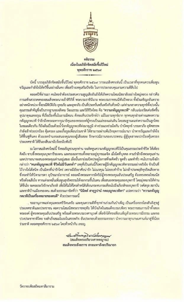 “บัดนี้ บรรลุอภิลักขิตสมัยขึ้นปีใหม่ พุทธศักราช ๒๕๖๙ วาระเถลิงศกเช่นนี้ เป็นเวลาที่ทุกคนควรเพิ่มพูนขวัญและกำลังใจให้ทวีขึ้นอย่างมั่นคง เพื่อสร้างเหตุเสริมปัจจัย ในการประกอบคุณงามความดีสืบไป