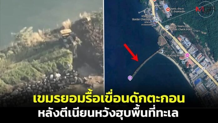 กัมพูชายอมรื้อเขื่อนดักตะกอนในทะเลใกล้บ้านหาดเล็ก ซึ่งเขมรสร้างไว้หวังได้พื้นที่ทางทะเลเพิ่ม แต่ล่าสุด หลัง ฉก.นย.ตราด คุมพื้นที่ชายแดนเบ็ดเสร็จได้ยื่นคำขาด หากไม่รื้อจะตัดเส้นทางส่งกำลังบำรุงบริเวณสะพานเกาะกง