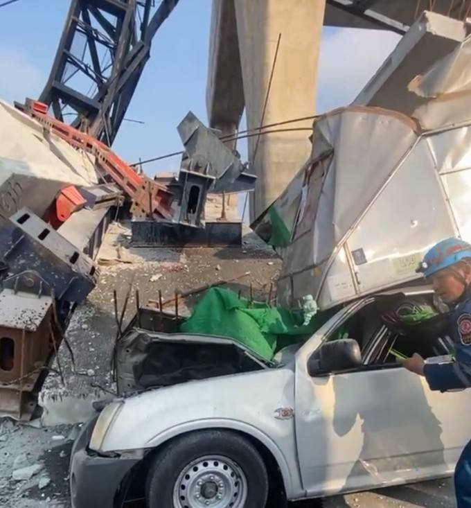 ความเสียหาย: เครนถล่มลงมาทับรถยนต์ส่วนบุคคล 2 คัน