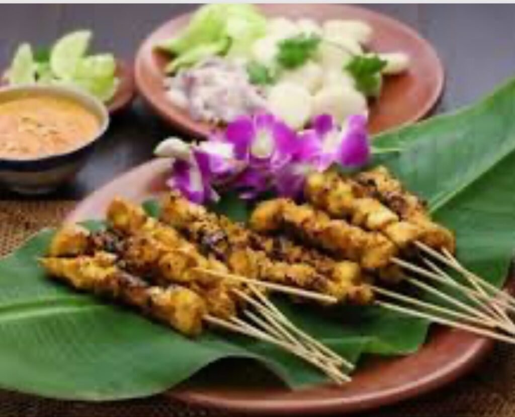 หรือสะเต๊ะไก่ Sate Ayam เป็นไก่หมักเครื่องเทศย่าง เสิร์ฟกับซอสถั่วเข้มข้น