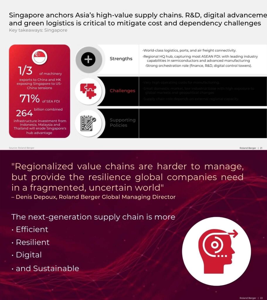 ในขณะเดียวกัน สิงคโปร์ ซึ่งเป็น “ฮับแห่งเอเชีย” (regional hub) มายาวนาน กำลังเผชิญแรงกดดันจากประเทศเพื่อนบ้านที่กำลังพัฒนาโครงสร้างพื้นฐานอย่างจริงจัง โดยรายงานของ Roland Berger ระบุว่า อินโดนีเซีย มาเลเซีย และไทย กำลังร่วมกันลงทุนในโครงสร้างพื้นฐานรวม 264,000 ล้านดอลลาร์สหรัฐ โดยเฉพาะท่าเรือน้ำลึก รถไฟความเร็วสูง และสนามบินขนาดใหญ่ ซึ่งจะค่อย ๆ ลดความได้เปรียบด้านโลจิสติกส์ของสิงคโปร์ ในขณะที่สิงคโปร์เองก็มีต้นทุนการดำเนินงานสูงมาก ทั้งค่าเช่า ค่าแรง ค่าที่ดิน และตลาดภายในประเทศเล็ก เพราะมีประชากรเพียง 6 ล้านคน สิงคโปร์จึงได้เปิดตัว Green Supply Chain Program มูลค่า 100 ล้านดอลลาร์สิงคโปร์ เพื่อสนับสนุนโลจิสติกส์คาร์บอนต่ำ (low-carbon logistics) และ Digital Trade Portals (ระบบการค้าดิจิทัล) เพื่อเร่งกระบวนการพิธีการศุลกากร พร้อมกับพยายามรักษาบทบาทการเป็น “ศูนย์กลางการเงิน R&D และดิจิทัล” ของภูมิภาคมากกว่าการเป็นศูนย์กลางการผลิต