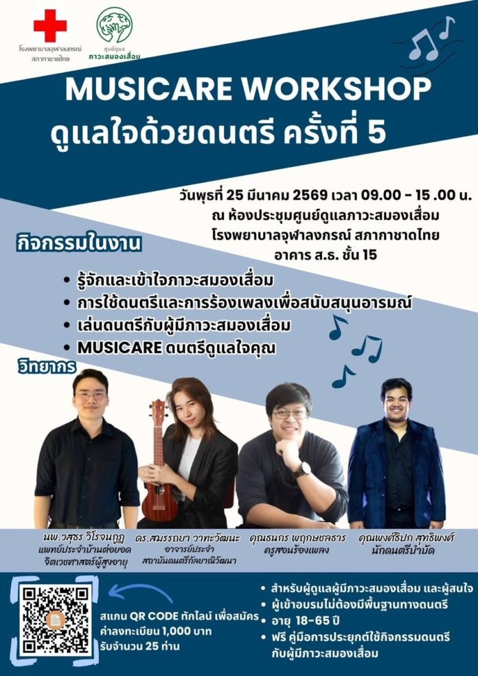 ศูนย์ดูแลภาวะสมองเสื่อม ขอเชิญผู้ดูแลผู้มีภาวะสมองเสื่อมและผู้สนใจเข้าร่วมกิจกรรมดนตรีบำบัด MUSICARE WORKSHOP ดูแลใจด้วยดนตรี ครั้งที่ 5 ร่วมรู้จักภาวะสมองเสื่อมและกิจกรรมทางดนตรีเพื่อประยุกต์ใช้กับผู้มีภาวะสมองเสื่อม