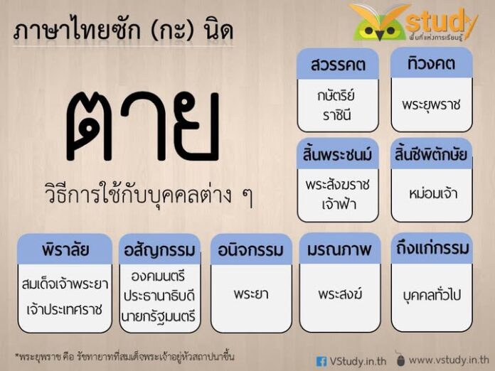 คำว่า “ตาย” มีคำราชาศัพท์และคำสุภาพหลายคำที่ใช้แตกต่างกันไปตามฐานะของผู้ที่เสียชีวิต โดยคำสามัญคือ “ตาย” ซึ่งใช้กับคนและสัตว์ทั่วไป, คำสุภาพสำหรับคนทั่วไปคือ “ถึงแก่กรรม”, ส่วนในระดับสูงขึ้นไปจะใช้คำว่า สวรรคต (กษัตริย์), ทิวงคต (พระยุพราช), สิ้นพระชนม์ (เจ้าฟ้า, พระองค์เจ้า, สังฆราช), สิ้นชีพิตักษัย (หม่อมเจ้า) เป็นต้น.