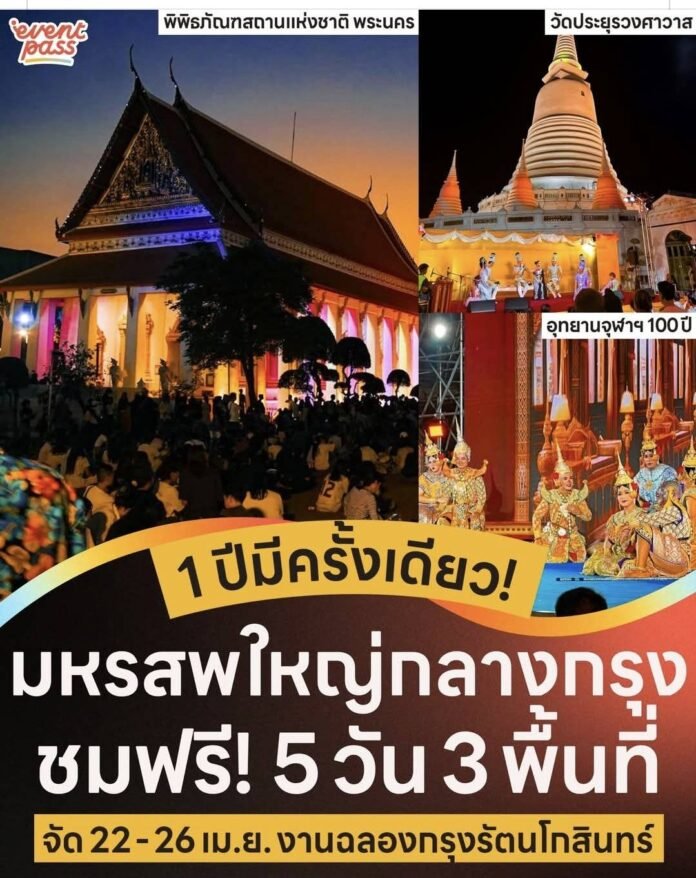 ชมมหรสพใหญ่ 3 พื้นที่พร้อมกัน 5 วัน 5 คืนเต็ม ดูโขน การแสดง หนังกลางแปลง เที่ยวพิพิธภัณฑ์ยามค่ำคืน เดินตลาดย้อนยุค ไหว้พระขอพร ชมงานไฟแสงสีเสียงจัดเต็ม #เข้าฟรีตลอดงาน จัดปีละครั้งเท่านั้น 📅 ตั้งแต่ 22 – 26 เม.ย. 69 คนกรุงห้ามพลาด