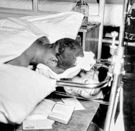 เมื่อมาริลีนไปถึงเตียงของเขา.เธอเข้าใจในทันทีว่าถ้าเธอยืนอยู่ตรงนั้นเหมือนคนอื่นๆ.เขาจะไม่มีวันได้เห็นหน้าเธอ.ดังนั้นเธอจึงไม่รีรอ.แต่เธอไม่โพสต์ท่า,เธอไม่ทำให้มันเป็นโมเมนต์ที่น่าจดจำ,เธอนั่งคุกเข่าลงโน้มตัวไปข้างหน้าแล้วเลื่อนศีรษะเข้าไปใต้เตียงในท่ากลับหัว.จนกระทั่งใบหน้ายิ้มแย้มของเธอปรากฏขึ้นในสายตาของเขา.