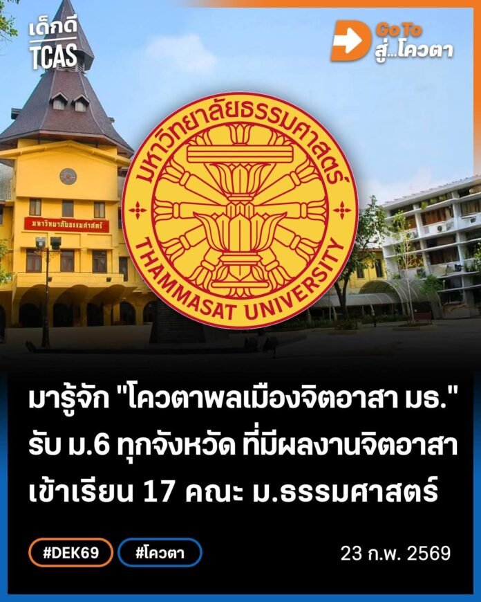 โควตาพลเมืองจิตอาสา ม.ธรรมศาสตร์ เป็นอีกหนึ่งโควตาที่ถูกพูดถึงหลายปี เหมาะกับน้องๆ ม.6 เด็กซิ่ว หรือเทียบเท่า ที่มีผลงานจิตอาสาหรือการทำกิจกรรมต่างๆ ที่โดดเด่น สามารถใช้ยื่นสมัครที่ ม.ธรรมศาสตร์ ในรอบโควตาได้เลย