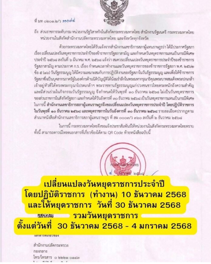 เปลี่ยนแปลงวันหยุดราชการประจำปี โดยปฏิบัติราชการ (ทำงาน) 10 ธันวาคม 2568 สำนักเลขาสภาผู้แทนราษฎร