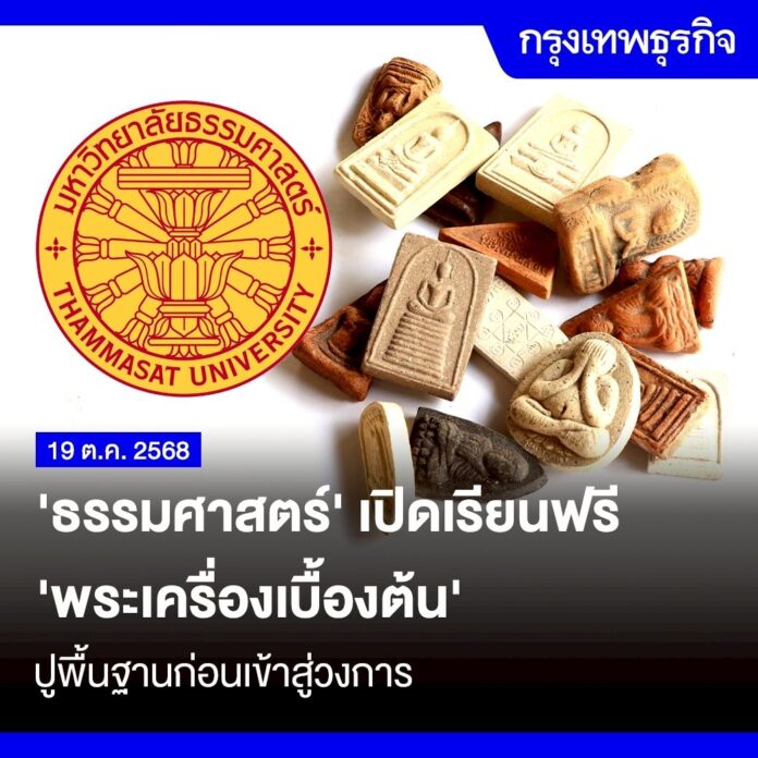 มหาวิทยาลัยธรรมศาสตร์ (มธ.) เปิดสอนหลักสูตรออนไลน์ “เรียนรู้พระเครื่องเบื้องต้น” ฟรี-ไม่มีค่าใช้จ่าย ครอบคลุมประวัติศาสตร์ ศิลปะ การดูพระ เกณฑ์ประเมินด้วยมุมมองวิชาการ ปูพื้นฐานก่อนเข้าสู่วงการพระ