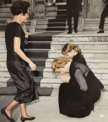 เบื้องพระพักตร์นั้น หม่อมเอลิสะเบธ จักรพงษ์ ณ อยุธยา หม่อมในพระองค์เจ้าจุลจักรพงษ์ และหม่อมราชวงศ์นริศรา จักรพงษ์ ธิดาเพียงคนเดียว ต่างน้อมหมอบกราบเฝ้ารับเสด็จ กริยามารยาทอันงดงามของทั้งสองปรากฏดุจภาพจำแห่งความจงรักภักดีและการรู้จักวางตนอย่างเหมาะสมในพระราชพิธี สะท้อนถึง “วัฒนธรรมแห่งความนอบน้อม” ซึ่งฝังรากลึกอยู่ในราชสกุลไทย
