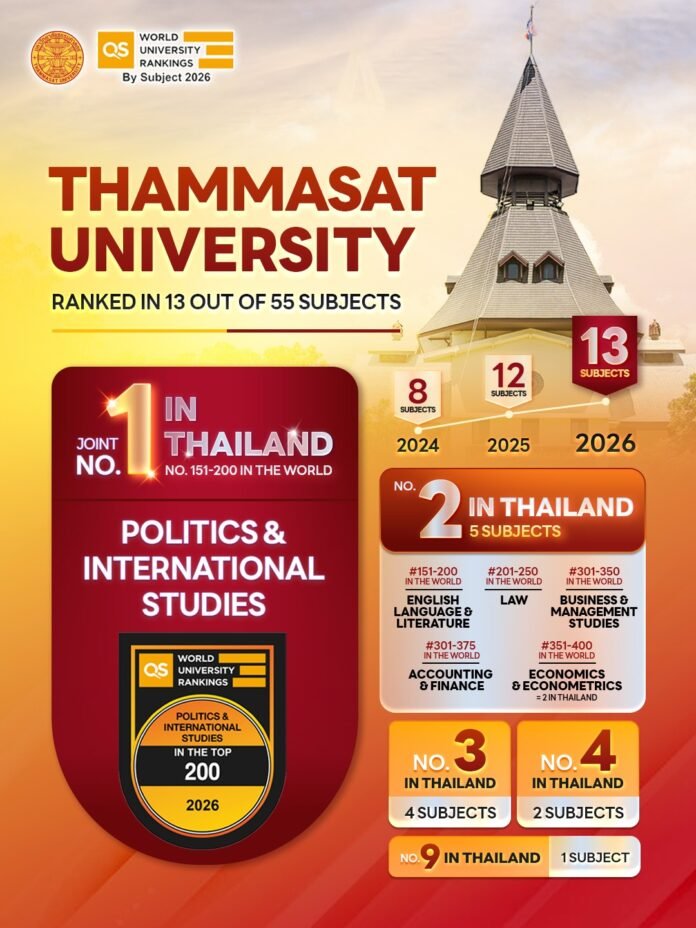 Thammasat University has been ranked in the QS World University Rankings by Subject 2026, with 13 out of 55 subjects recognized 🌍