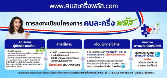 นอกจากนี้ โครงการคนละครึ่งพลัส ยังเพิ่มสิทธิฟู้ดเดลิเวอรี่ สามารถเริ่มใช้สิทธิผ่านแอพพลิเคชั่น “เป๋าตัง” ตั้งแต่วันที่ 7 พ.ย.-31 ธ.ค.2568 เวลา 06.00-21.00 น. ของทุกวัน
