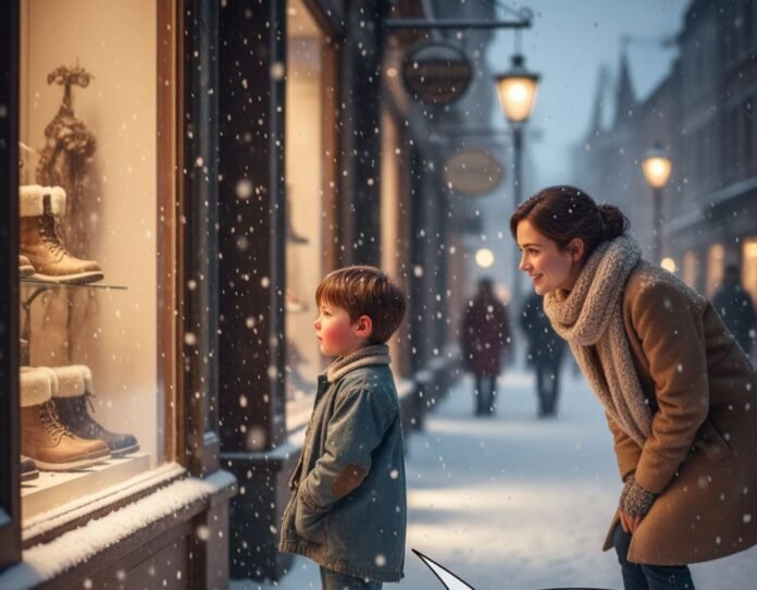 หญิงคนนั้นไม่ลังเลเลย เธอจับมือเล็ก ๆ ที่เย็นเฉียบของเด็กชาย แล้วพาเข้าไปในร้านรองเท้า