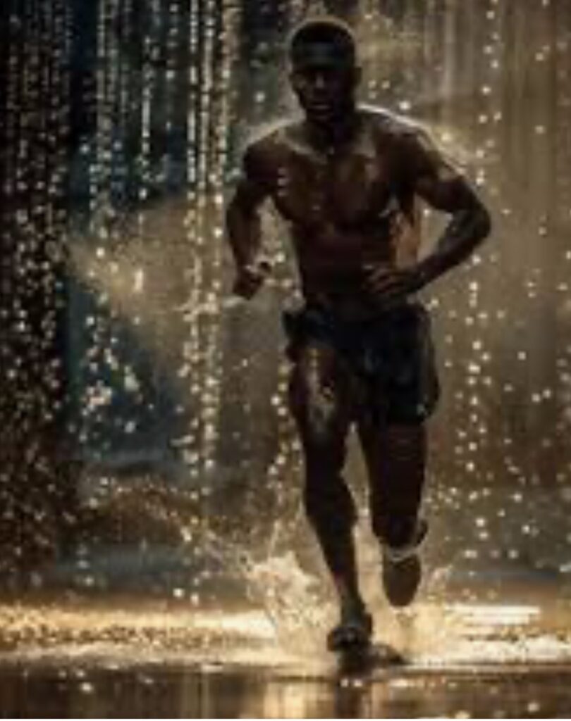 เสียงหัวเราะและเสียงหอบดังรอบตัว น้ำฝนเข้าตา เขาแทบมองไม่เห็นทาง ทุกอย่างพร่าเลือนเหมือนหมอกหนา
