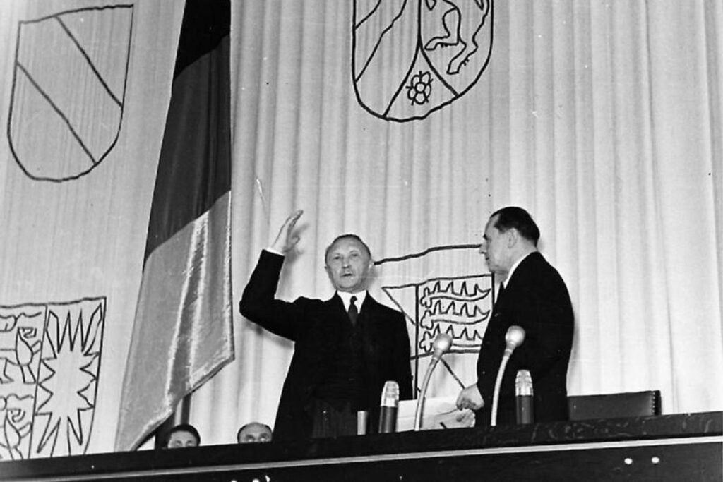 เขาเคยดำรงตำแหน่งนายกเทศมนตรีเมืองโคโลญ และถูกปลด ถูกไล่ล่า และถูกคุมขังในสมัยนาซี เพราะปฏิเสธการร่วมมือกับระบอบเผด็จการ นี่ไม่ใช่เพียงเรื่องส่วนตัว หากเป็นรากฐานของ “ความชอบธรรมทางศีลธรรม” (moral authority) ที่สำคัญยิ่งในเวลาต่อมา