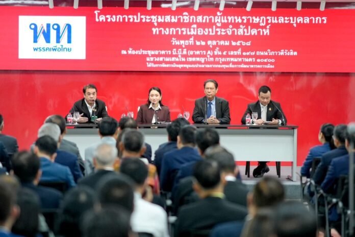 เมื่อวันที่ 22 ต.ค.2568 ที่พรรคเพื่อไทย ผู้สื่อข่าวรายงานว่า หลังจากน.ส.แพทองธาร ชินวัตร อดีตหัวหน้าพรรคเพื่อไทย ลาออกจากการเป็นหัวหน้าพรรค ทำให้คณะกรรมการบริหารพรรคเพื่อไทยชุดปัจจุบัน พ้นจากตำแหน่งทั้งหมดและทำหน้าที่รักษาการจนกว่าจะมีการเลือกหัวหน้าพรรคคนใหม่มาทำหน้าที่