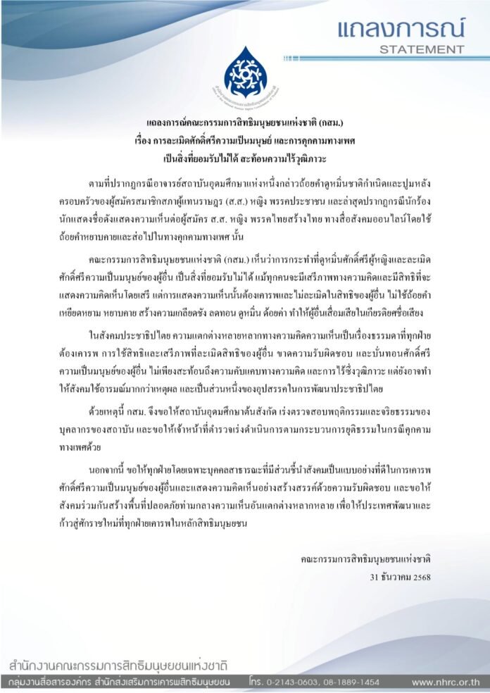 ต่อมา คณะกรรมการสิทธิมนุษยชนแห่งชาติ กสม. ออกแถลงการณ์ประณามการกระทำดังกล่าวอย่างชัดเจน โดยชี้ว่าเป็นการละเมิดศักดิ์ศรีความเป็นมนุษย์ และต้องให้กระบวนการยุติธรรมจัดการอย่างจริงจัง ท่าทีนี้เกิดขึ้นพร้อมกับการบังคับใช้บทแก้ไขประมวลกฎหมายอาญาที่เพิ่มความผิดและโทษเกี่ยวกับการคุกคามทางเพศ ซึ่งไม่ใช่เพียงโทษปรับ แต่รวมถึงโทษจำคุก นับเป็นสัญญาณว่ารัฐกำลังยกระดับมาตรฐานการคุ้มครองสิทธิในยุคดิจิทัล