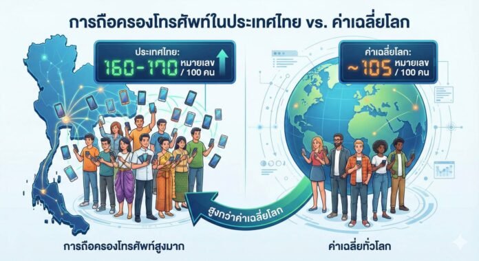 ประเทศไทยอยู่ในกลุ่มประเทศที่มีการถือครองโทรศัพท์สูง โดยมีประมาณ 160-170 หมายเลขต่อ 100 คน สูงกว่าค่าเฉลี่ยโลกอย่างมีนัยสำคัญ ตัวเลขเหล่านี้ไม่ได้หมายความว่าทุกคนมีโทรศัพท์หลายเครื่องประการเดียว แต่สะท้อนโครงสร้างการใช้ชีวิตที่พึ่งพาการสื่อสารดิจิทัลในระดับต่างกัน