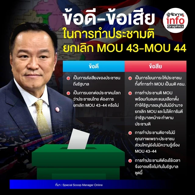 ประเด็นบันทึกความเข้าใจ MOU 43 และ MOU 44 ระหว่างไทยกับกัมพูชา กลับมาเป็นจุดร้อนทางการเมืองอีกครั้ง ภายหลังรัฐบาลภายใต้การนำของนายอนุทิน ชาญวีรกูล เสนอให้มีการทำประชามติ เพื่อตัดสินใจว่าจะยกเลิกหรือไม่ ท่ามกลางเสียงวิพากษ์จากหลายฝ่ายว่า การทำประชามติในประเด็นซับซ้อนเช่นนี้ มิได้สะท้อนการมีส่วนร่วมที่แท้จริง แต่กลับเป็นการโยนภาระการตัดสินใจไปให้ประชาชน โดยเฉพาะเมื่อคนส่วนใหญ่ไม่เคยเข้าถึงรายละเอียดของบันทึกความเข้าใจทั้งสองฉบับ