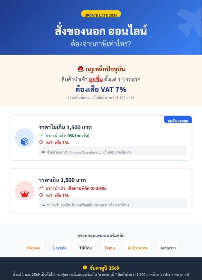 รัฐบาลเตรียมบังคับใช้มาตรการจัดเก็บอากรนำเข้าและภาษีมูลค่าเพิ่ม (VAT) กับสินค้าที่สั่งซื้อผ่านแพลตฟอร์มอีคอมเมิร์ซจากต่างประเทศ ตั้งแต่ มูลค่า 1 บาทขึ้นไป ครอบคลุมแพลตฟอร์มหลักอย่าง Temu, Shopee, Lazada, TikTok Shop, AliExpress, Alibaba, Amazon และ eBay หลังยกเลิกการยกเว้นภาษีเดิมที่ใช้กับสินค้ามูลค่าต่ำกว่า 1,500 บาท โดยให้เหตุผลว่าเพื่อสร้างความเป็นธรรมทางการค้า และลดความได้เปรียบของสินค้านำเข้าราคาถูกที่หลั่งไหลเข้าสู่ตลาดไทยมานานหลายป้