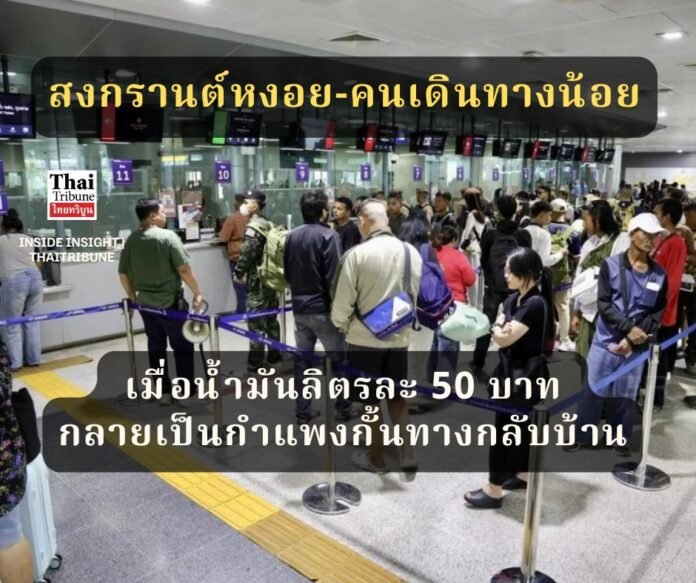 จากข้อมูลตรวจสอบพบว่า สงครามในภูมิภาคตะวันออกกลางที่ปะทุขึ้นตั้งแต่เดือนกุมภาพันธ์ 2569 ได้สร้างแรงสั่นสะเทือนต่อราคาน้ำมันในประเทศอย่างรุนแรง โดยเฉพาะในช่วงก่อนเทศกาลสงกรานต์เพียงหนึ่งสัปดาห์ ราคาน้ำมันดีเซลพุ่งขึ้นถึง 47.74 บาทต่อลิตร และในบางพื้นที่สูงแตะ 50 บาท ส่งผลให้ต้นทุนการเดินทางด้วยรถยนต์ส่วนตัวพุ่งสูงขึ้นกว่าปีก่อนเกือบ 40% ทำให้แผนการเดินทางกลับภูมิลำเนาของครอบครัวชนชั้นกลางและแรงงานถูกยกเลิกเป็นจำนวนมาก