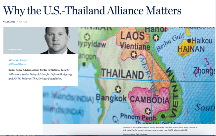 1 กันยายน 2568 The Heritage Foundation องค์กรวิจัยด้านนโยบายสาธารณะชื่อดังของสหรัฐฯ เผยแพร่บทความเกี่ยวกับความตึงเครียดระหว่างไทยกับกัมพูชา โดยระบุว่ากัมพูชาเป็นฝ่ายปลุกปั่นความขัดแย้งและเล็งโจมตีพื้นที่พลเรือนไทยด้วยจรวด BM-21 และแนะนำให้อเมริกาควรสนับสนุนไทย ซึ่งถือเป็นพันธมิตรตามสนธิสัญญาและมีความร่วมมือทางทหารมายาวนาน