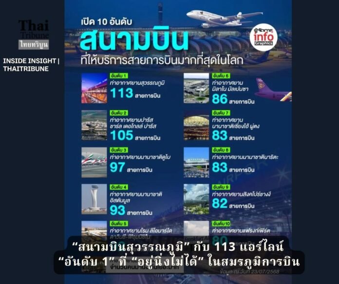 ท่าอากาศยานสุวรรณภูมิกลายเป็นหนึ่งในสนามบินที่มีสายการบินพาณิชย์ใช้บริการมากถึง 113 สายการบิน สะท้อนบทบาท “ประตูการบินของภูมิภาค” อย่างชัดเจน ตัวเลขดังกล่าวไม่ใช่เพียงความสำเร็จเชิงภาพลักษณ์ แต่เป็นผลจากทำเลทางภูมิศาสตร์ที่เชื่อมโลกตะวันออกกับตะวันตก นโยบายเปิดกว้างต่อสายการบินทุกโมเดล และตลาดผู้โดยสารปลายทางที่แข็งแรงจากการท่องเที่ยว ธุรกิจ และแรงงานข้ามชาติ