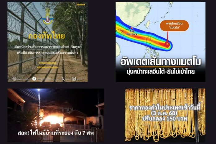 – สมช. ไฟเขียวงบสร้างรั้วชายแดน ที่ประชุมสภาความมั่นคงแห่งชาติ (สมช.) เห็นชอบงบประมาณกว่า 800 ล้านบาท เดินหน้าโครงการสร้างรั้วกั้นชายแดนไทย-กัมพูชา ระยะทาง 16 กิโลเมตร เพื่อป้องกันการรุกล้ำและเสริมความมั่นคง