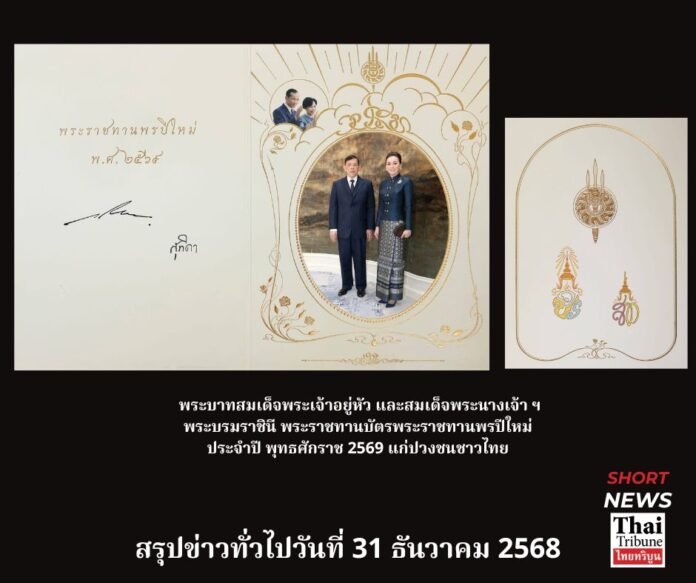 @เมื่อวันที่ 31 ธันวาคม 2568 พระบาทสมเด็จพระเจ้าอยู่หัว และสมเด็จพระนางเจ้า ฯ พระบรมราชินี พระราชทานบัตรพระราชทานพรปีใหม่ ประจำปี พุทธศักราช 2569 แก่ปวงชนชาวไทย ด้านหน้าของบัตรพระราชทานพรปีใหม่ มีตราประจำพระราชวงศ์จักรีอยู่กึ่งกลาง ด้านล่างซ้ายเป็นพระปรมาภิไธย ว.ป.ร. และด้านล่างขวาเป็นพระนามาภิไธย ส.ท. เมื่อเปิดบัตรพระราชทานพร ด้านซ้ายมีข้อความว่า “พระราชทานพรปีใหม่ พ.ศ. ๒๕๖๙“ พร้อมทั้งทรงลงพระปรมาภิไธย และพระนามาภิไธย