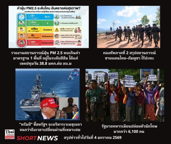 @วันนี้ (4 ม.ค.) เวลา 07.00 น. ศูนย์ข้อมูลคุณภาพอากาศ กทม.รายงานสถานการณ์ฝุ่น PM 2.5 พบเกินค่ามาตรฐาน 1 พื้นที่ อยู่ในระดับสีส้ม ได้แก่ เขตปทุมวัน 38.8 มคก.ต่อ ลบ.ม